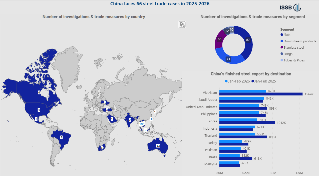 24 March 2026: China's finished steel exports fell 8.1% year-on-year during January-February 2026, reaching 15.6 million tonnes (around 7.8 million tonnes each month). This decline is primarily driven by trade measures against China and is expected to continue in the coming months, with flat products facing the highest number of trade restrictions.