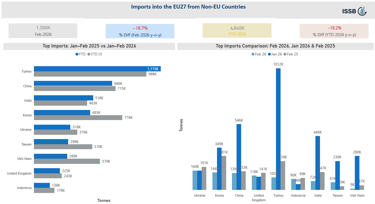 9 April 2026: In February 2026, EU finished steel imports from non-EU countries dropped by 18.7% year-on-year to 1.3 million tonnes (mln t), amid tighter import regulations to protect domestic producers and advance green goals. Year-to-date figures declined by 18.2% to 4.84 mln t.