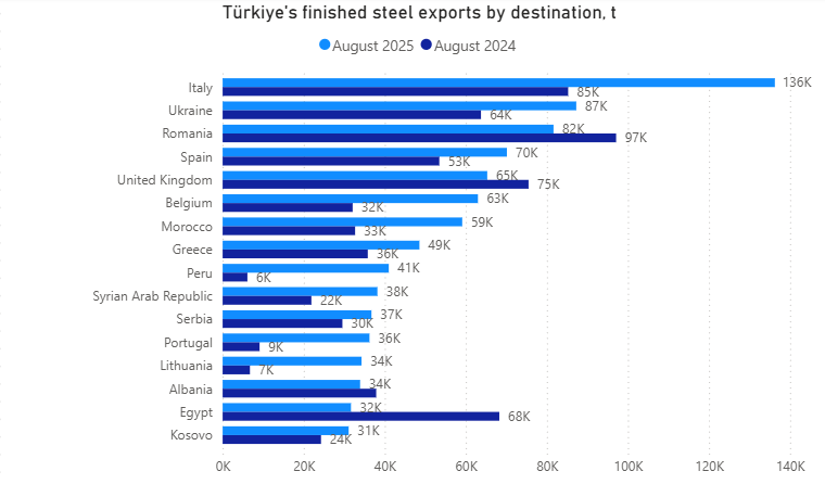 European customers continued replenishing stocks with imported material ahead of the upcoming CBAM regulations, with ample quota still available. Turkish deliveries to Italy, Spain and Belgium in August jumped by 59.8%, 36.9% and 96.4% year-on-year, to 136 thousand tonnes (kt), 70 kt and 63 kt, respectively. Ukraine raised imports of Turkish finished steel from 64 kt to 87 kt over the same period amid increased requirements.