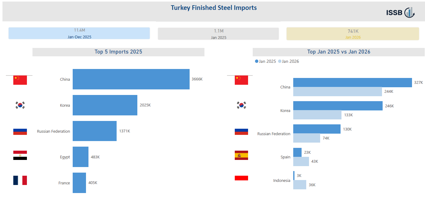 The total finished steel imports to Turkey in January 2026 decreased by 30.9% compared to January 2025.